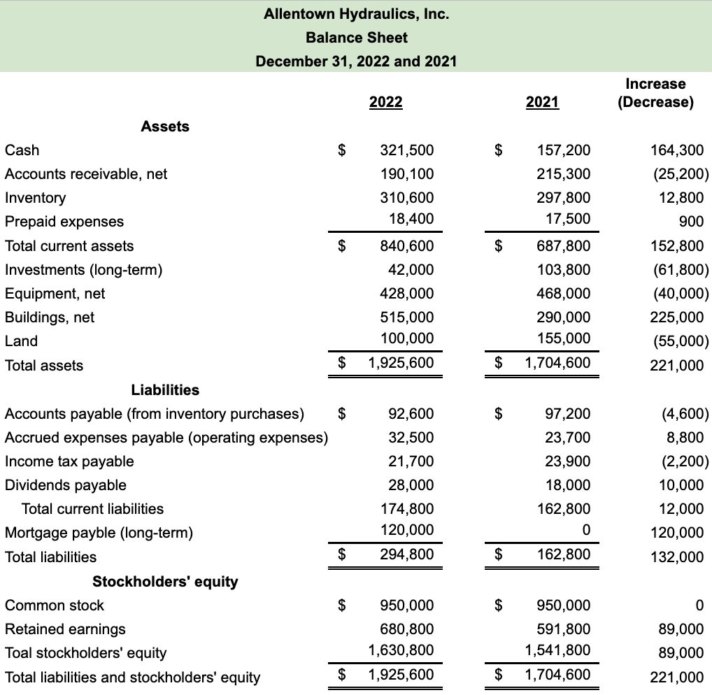 Allentown Hydraulics Inc. is a midsized producer of hydraulic parts used in many industries and has customers all over the world. We will use their most recent income statement for 2022 and a comparative balance sheet for 2022 and 2021 to demonstrate the process for preparing the operating activities section of the statement of cash flows using the direct method.