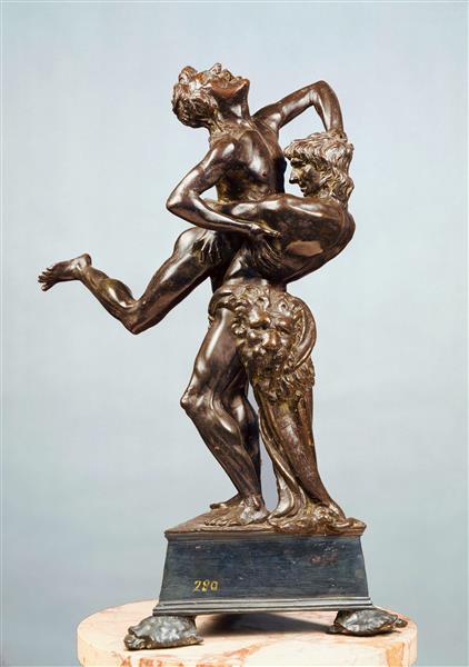 The Renaissance interest in classical culture naturally also led to the revival of Greco-Roman mythological themes in art. For example, Antonio del Pollaiuolo's table-sized bronze sculpture of Hercules and Antaeus vividly illustrates this trend, depicting a dramatic moment from classical mythology with a renewed focus on anatomical precision and dynamic movement. This work exemplifies the period's fascination with ancient myths and its commitment to reviving and reinterpreting them through the lens of Renaissance artistry.