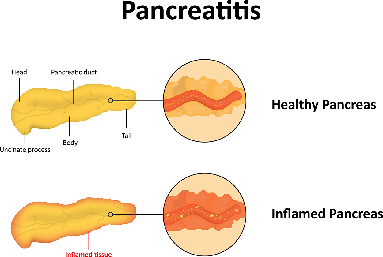 Pancreatitis can be acute (sudden and short-term) or chronic (long-lasting, in which the pancreas does not heal).