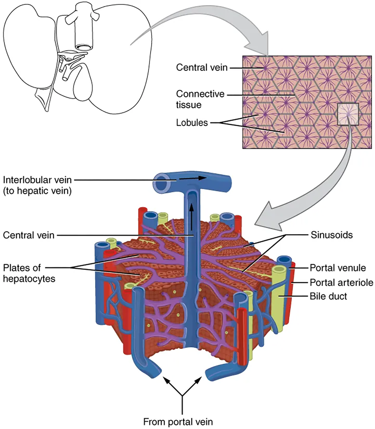 Microscopic Anatomy of the Liver—The liver receives oxygenated blood from the hepatic artery and nutrient-rich deoxygenated blood from the hepatic portal vein.