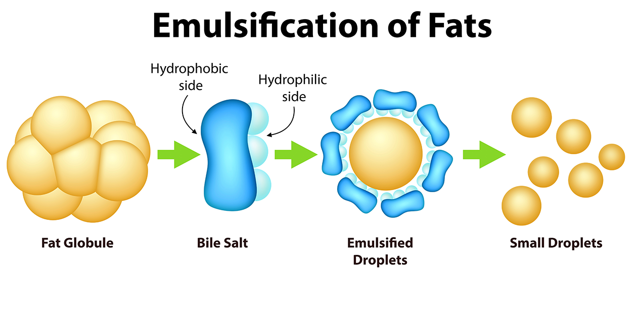 Recall that lipids are hydrophobic; that is, they do not dissolve in water. Thus, before they can be digested in the watery environment of the small intestine, large lipid globules must be broken down into smaller lipid globules, a process called emulsification. Recall that bile is a mixture secreted by the liver to accomplish the emulsification of lipids in the small intestine.