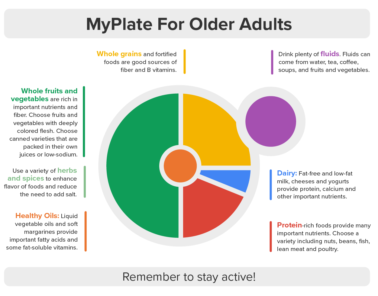 Setting dietary standards for adults is difficult because individual differences become more pronounced as people grow older. Energy needs decline an estimated 5% per decade. The basal metabolic rate declines 1 to 2% per decade in part because lean body mass and thyroid hormones diminish as we get older. The lower energy expenditure of older adults means that they need to eat less food to maintain their weight. For this reason, it is important that they select mostly nutrient-dense foods. MyPlate, based off of the USDA Food Patterns (Dietary Guidelines for Americans), offers dietary guidance for adults of all ages.