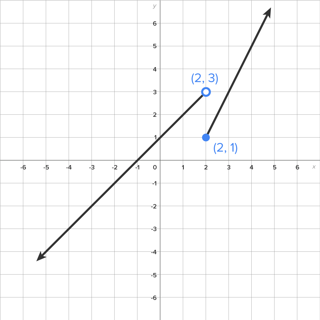 If both circles were closed, then the graph would not represent a function. A common error is to close both circles at the breaking point, so be sure to double check which one is included and which one is not, since both cannot be included!