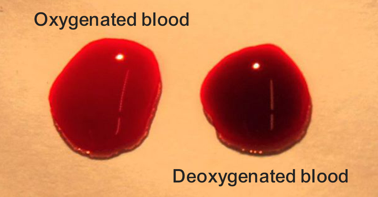 Blood—Blood changes color depending on how much oxygen is bound to hemoglobin. Oxygenated blood is bright red (left), while deoxygenated blood is dark red (right).