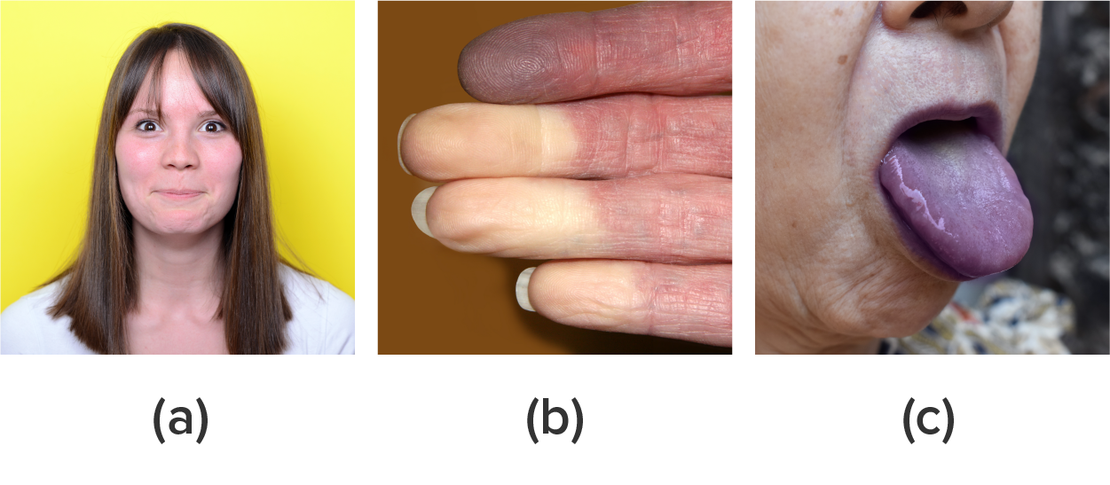 Blood and Skin Color—The blood present underneath the skin plays a role in its color. (a) The presence of extra oxygenated blood can turn the skin red, such as when you blush. (b) The lack of blood can turn the skin white, such as during poor peripheral circulation. (c) The presence of deoxygenated blood can turn the skin blue.