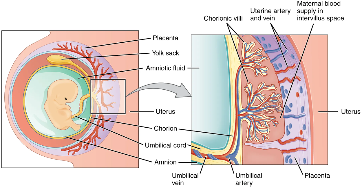 The mature placenta is composed of tissues derived from the embryo and maternal tissues of the endometrium. The placenta connects to the embryo via the umbilical cord, which carries deoxygenated blood and wastes throughout pregnancy from the fetus through two umbilical arteries; nutrients and oxygen are carried from the pregnant person to the fetus through the single umbilical vein. The umbilical cord is surrounded by the amnion, and the spaces within the cord around the blood vessels are filled with Wharton’s jelly, which is a gelatinous connective tissue.