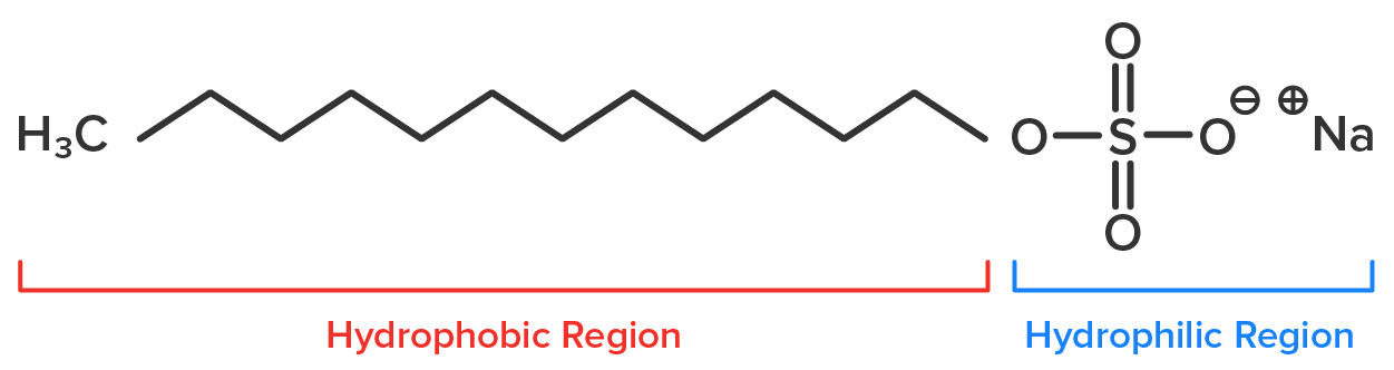 When you lather your hands up with soap, the SLS/SDS molecules will work to satisfy both of their regions. The hydrophobic region, which is most stable away from water, will insert itself into the hydrophobic material on your hand that you’re trying to remove (e.g., oil and grease).