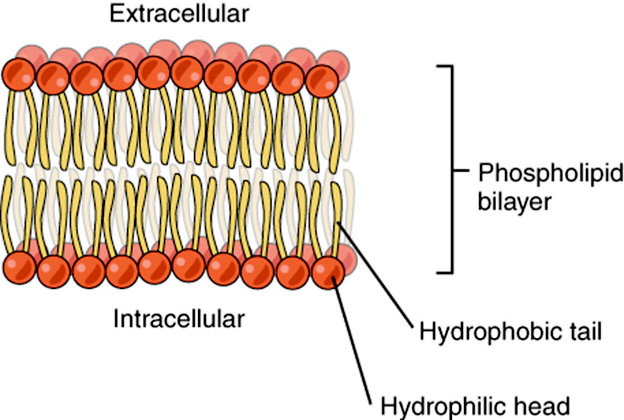 A phospholipid molecule has a hydrophilic phosphate group on one end, called the “head,” and two side-by-side hydrophobic fatty acid chains that make up the lipid tails. The phosphate heads are thus attracted to the water molecules of both the extracellular and intracellular environments, while the lipid tails will actively position themselves away from water.