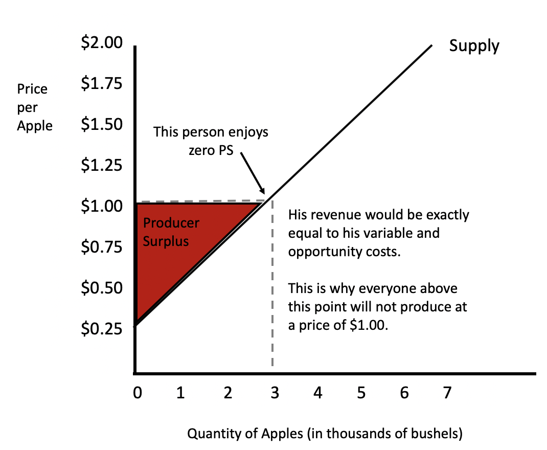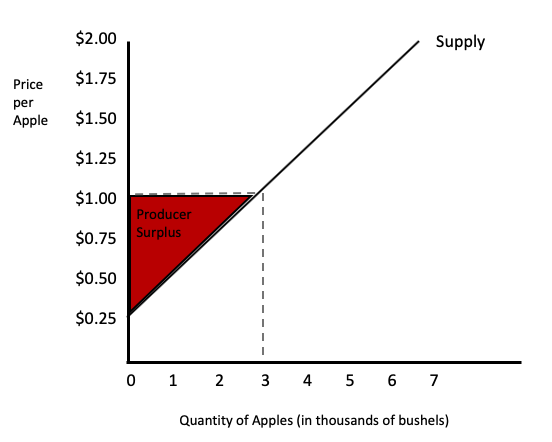 Suppose you are selling baseball cards on eBay and you decide that you would be willing to accept as little as $25 for a particular card. Then, someone offers you $40 for it. In this situation, you would have enjoyed a producer surplus of $15--the difference between what you were willing to accept for the card, and what you actually received.So, referring back to our supply curve with apples, let's say the market price for apples is $1. You can see that at the price of $1, 3,000 bushels of apples will be produced.