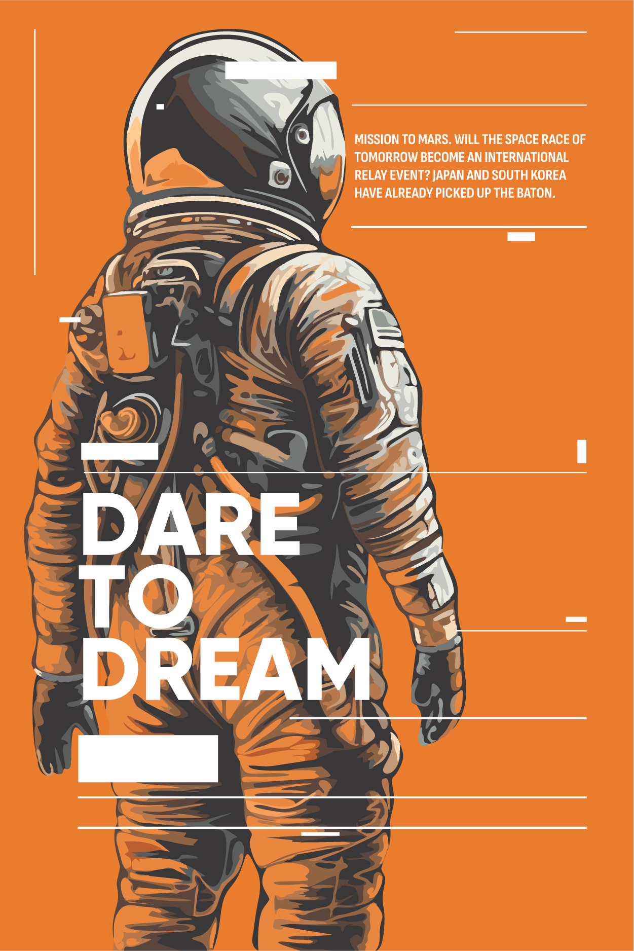 In the following image, an astronaut looks off the page. Text reading "Dare to Dream" is layered over the astronaut’s body. Smaller text is positioned in close proximity to his helmet. The text in close proximity with the astronaut communicates to the reader that the words and images belong together and are telling the same story.