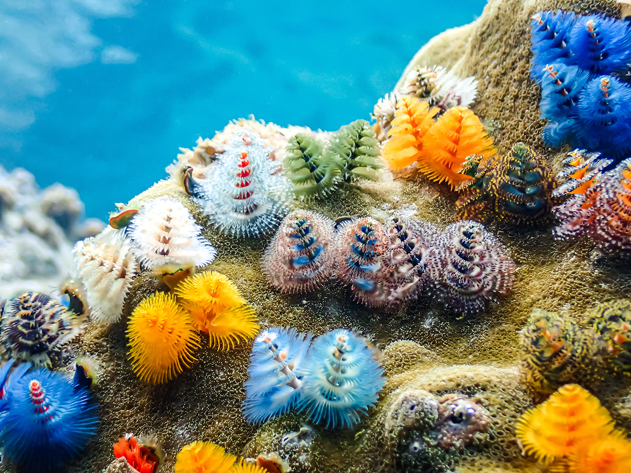 Below is an image of a group of Christmas tree worms. The objects that look like small, colorful Christmas trees are actually the tails of worms that live inside rocks in some coral reefs.