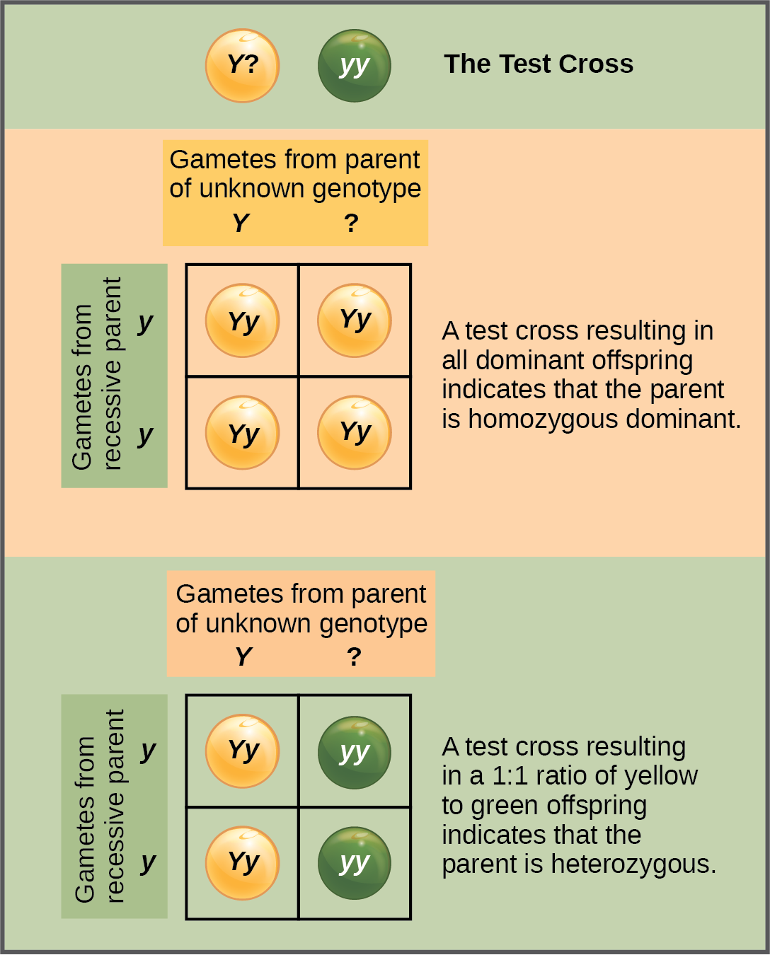 Beyond predicting the offspring of a cross between known homozygous or heterozygous parents, Mendel also developed a way to determine whether an organism that expressed a dominant trait was a heterozygote or a homozygote. Called the test cross, this technique is still used by plant and animal breeders. In a test cross, the dominant-expressing organism is crossed with an organism that is homozygous recessive for the same characteristic. If the dominant-expressing organism is a homozygote, then all F1 offspring will be heterozygotes expressing the dominant trait. Alternatively, if the dominant expressing organism is a heterozygote, the F1 offspring will exhibit a 1:1 ratio of heterozygotes and recessive homozygotes. The test cross further validates Mendel’s postulate that pairs of unit factors segregate equally.