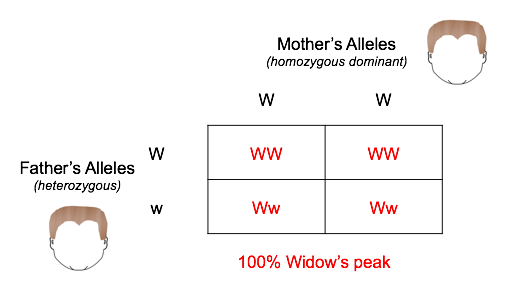 The mom in this example is homozygous dominant for a widow's peak. This means that she has the same alleles (W and W), and both are dominant. Her phenotype would be the dominant trait, which in this case means she has a widow’s peak.