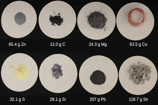 In the image above, each sample contains 6.022 ×1023 atoms —1.00 mol of atoms. From left to right (top row): 65.4 g zinc, 12.0 g carbon, 24.3 g magnesium, and 63.5 g copper. From left to right (bottom row): 32.1 g sulfur, 28.1 g silicon, 207 g lead, and 118.7 g tin.
