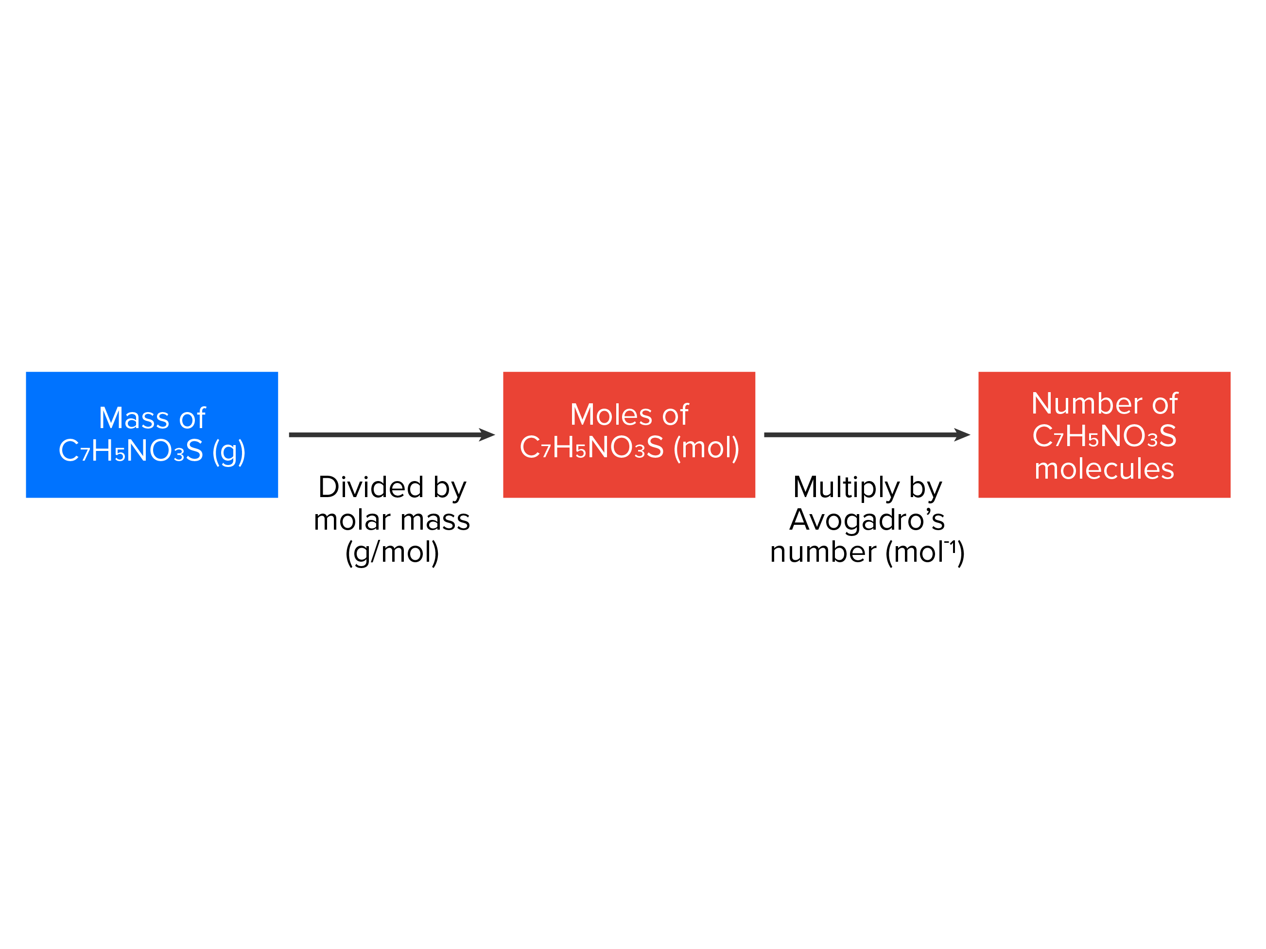 | moles x Avogadro’s number (6.022 x 1023) = molecules (or atoms) |