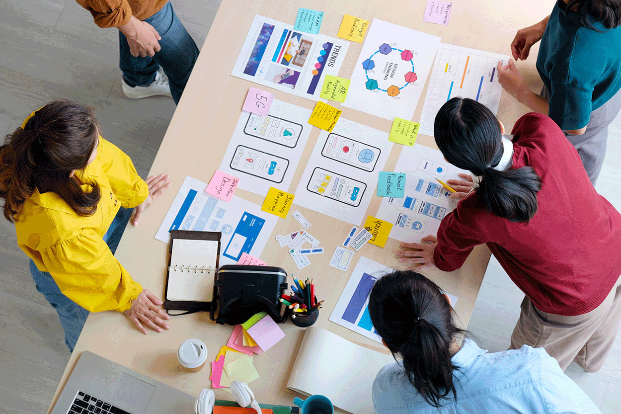 The image below shows a design team working through a brainstorming session. Remember that the team members are stakeholders because they have a special interest in the design’s success.