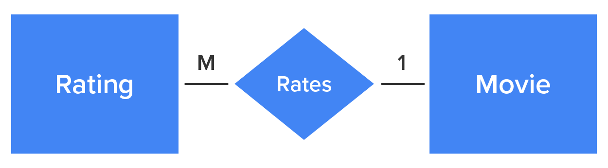 For example, a company might have an employee who works on multiple projects, and each project might have multiple employees working on it. You would need to create a linking table between the Employee table and the Project table, perhaps one called Assignment, to contain the primary key of the Employee table and the primary key of the project table. If this linking table is not referenced anywhere else, you may simply choose to use the combination of the foreign keys as the primary key. However, if the table is referenced from other tables, creating a new primary key is probably the best choice so that there is only one value to track in those related tables, rather than a combination of the other two (or more) keys.Recall that using Chen notation, you signify a relationship between two entities by drawing a diamond, with an action verb describing the relationship written inside. Alongside each entity on the relationship line, you define the cardinality to show which side is the one and which side is the many. Let's go back to the movie ratings ERD from the prior lesson.