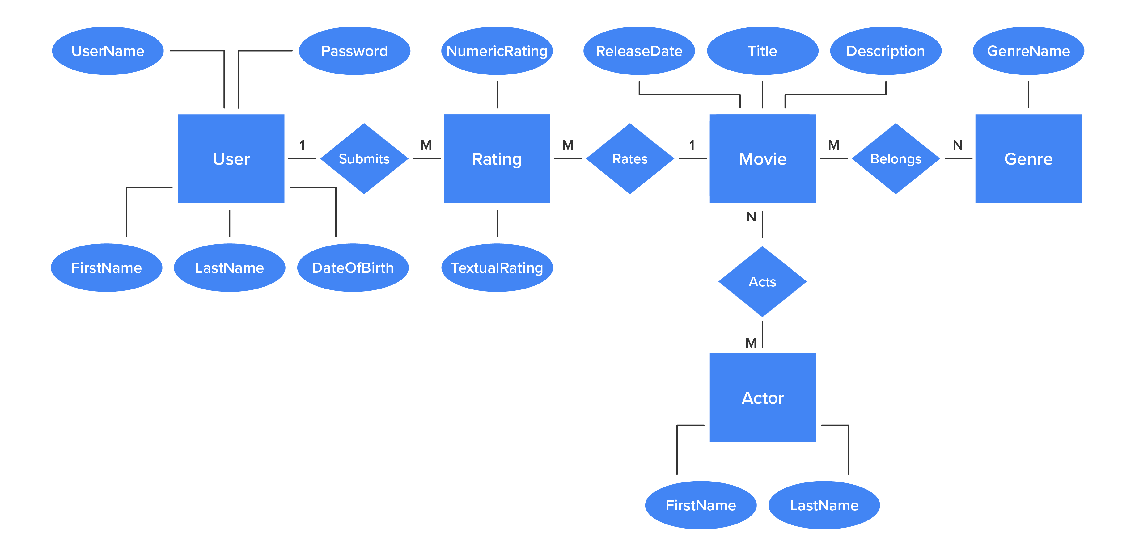 alt=The relationship between the entities Movie and Genre is expressed as a diamond with the text ‘Belongs’ in it. The associations are illustrated by a line between the entities and relationships with the cardinality indicators ‘M’ and ‘N’ on either side of the diamond.]