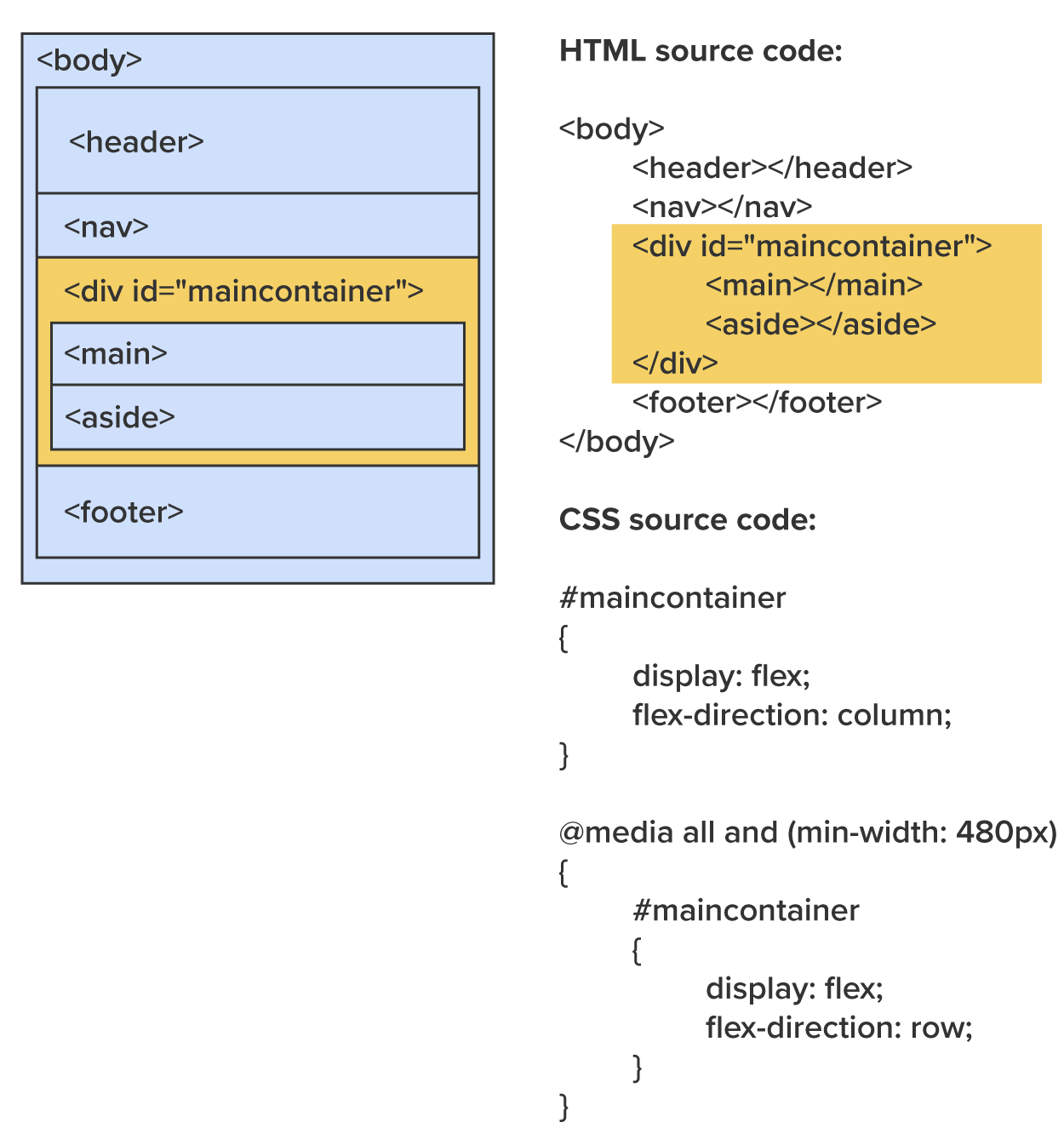 In the example, we set the #maincontainer as the flex container using “display:flex” and set the flex-direction to “column.” This allows the sections to stack vertically and allows for all content to fit on the screen and avoid forcing the user to scroll horizontally. Then, whenever the screen width reaches 480 pixels or more, the media query will activate its block of style rules and override the flex-direction with “row.” This allows both the main and aside sections to be displayed on screen and take advantage of the wider viewport.