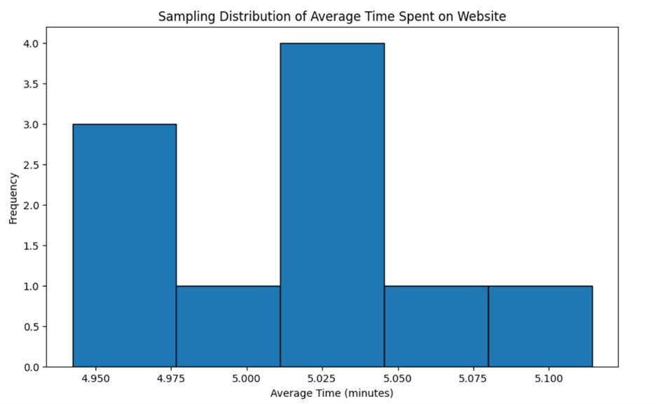 Imagine you take 10 different samples of 100 visitors each and calculate the average time spent on the website for each sample. You might get averages like 5 minutes, 5.2 minutes, 4.8 minutes, etc. If you plot these averages on a graph, you’ll see a distribution of these sample averages. This is your sampling distribution. The histogram below shows a sampling distribution of the average time spent on a website using 10 different samples of 100 visitors each.