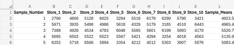 shown in the spreadsheet below. The first five rows of the sampling distribution for sales_CLT.xlsx are shown below.