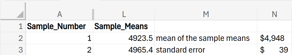 can be found by taking the mean of the sample means in column L. In Excel, in cell N2, enter: