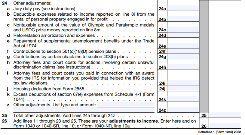 The following list describes common other adjustments on lines 24a through 24z of Schedule 1: