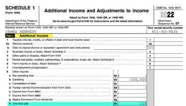 A taxpayer may have other adjustments to income that do not have a designated line to be reported on Form 1040 or any of the schedules. Schedule 1 (Form 1040), line 24, is titled “Other adjustments” and can be considered a “catchall” for those other types of adjustments.