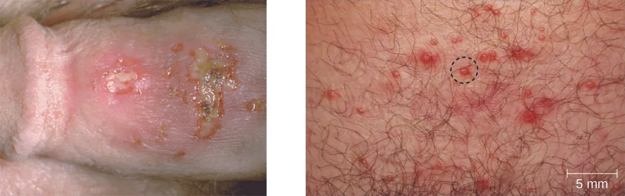 Genital herpes is a common condition caused by the herpes simplex virus, an enveloped, double-stranded DNA virus that is classified into two distinct types. Herpes simplex virus has several virulence factors, including infected cell protein (ICP) 34.5, which helps in replication and inhibits the maturation of dendritic cells as a mechanism of avoiding elimination by the immune system. In addition, surface glycoproteins on the viral envelope promote the coating of herpes simplex virus with antibodies and complement factors, allowing the virus to appear as “self” and prevent immune system activation and elimination.