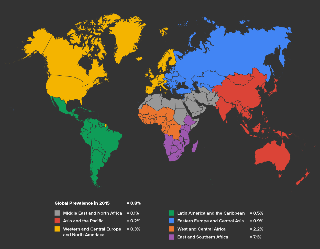 Human immunodeficiency virus (HIV) is a retrovirus (viruses that use RNA to replicate inside host cells, where their DNA is then integrated with the host’s DNA), and it is the causative agent of acquired immune deficiency syndrome (AIDS). There are two main variants of HIV. HIV-1 occurs in human populations worldwide, whereas HIV-2 is concentrated in West Africa. Currently, the most affected region in the world is sub-Saharan Africa, with an estimated 25.6 million people living with HIV in 2015. Sub-Saharan Africa also accounted for two-thirds of the global total of new HIV infections.