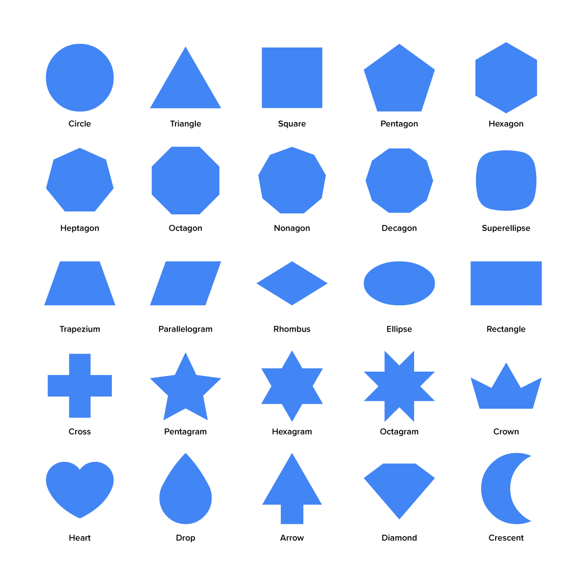 There are two categories of shapes: geometric and organic. Geometric shapes have uniform measurements and generally don’t appear in nature. Examples of geometric shapes include squares, rectangles, circles, and triangles. Although there are many different geometric shapes, they are rooted in three types: the rectangle, ellipse, and polygon. A rectangle is any four-sided shape, including squares. An ellipse is an oval shape, which includes circles. A polygon is any multisided shape with the exception of rectangles and squares. Triangles, stars, pentagons, hexagons, heptagons, and octagons are all examples of polygons.