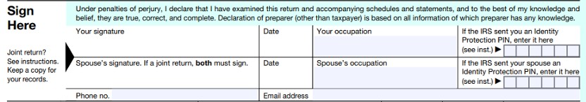 Every taxpayer must sign their own return. A joint return must be signed by both the taxpayer and the spouse. The date of signing, occupations, daytime telephone number, and email should be entered in the appropriate spaces.