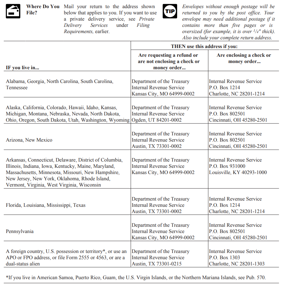 Depending on where the taxpayer lives and whether they are receiving a refund or enclosing a payment, the IRS provides specific addresses for the return to be mailed.
