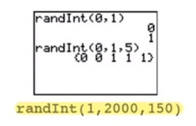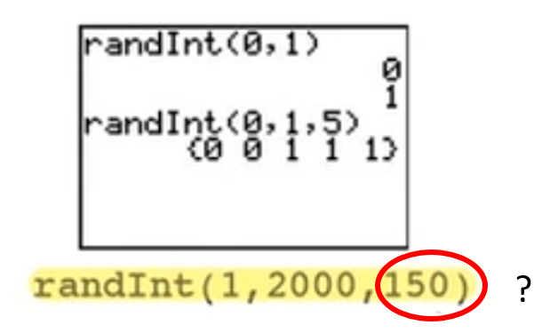 “RandInt” indicates a random integer—an integer is a whole number—from 0 to 1. Therefore, it picks either 0 or 1. When you put in the third number, it's asking how many of them you want. In this case, you entered five. Now, you don't want numbers between 0 and 1 in this case, and you don't want five of them. You want numbers between 0 and 2,000, and you want 100 of them. Now, why was 150 written when you only want 100 numbers?