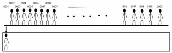 Suppose that we want to take a sample of 100 individuals from a population of 2,000 people. Below you will see some of those individuals lined up, and you can imagine that individuals 10 through 1,995 are somewhere in the middle. Each is assigned a unique number so no one can have the same number as anybody else.