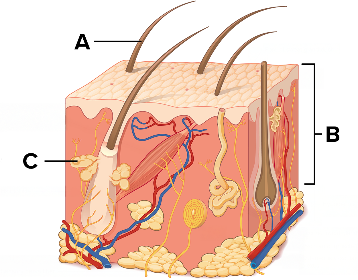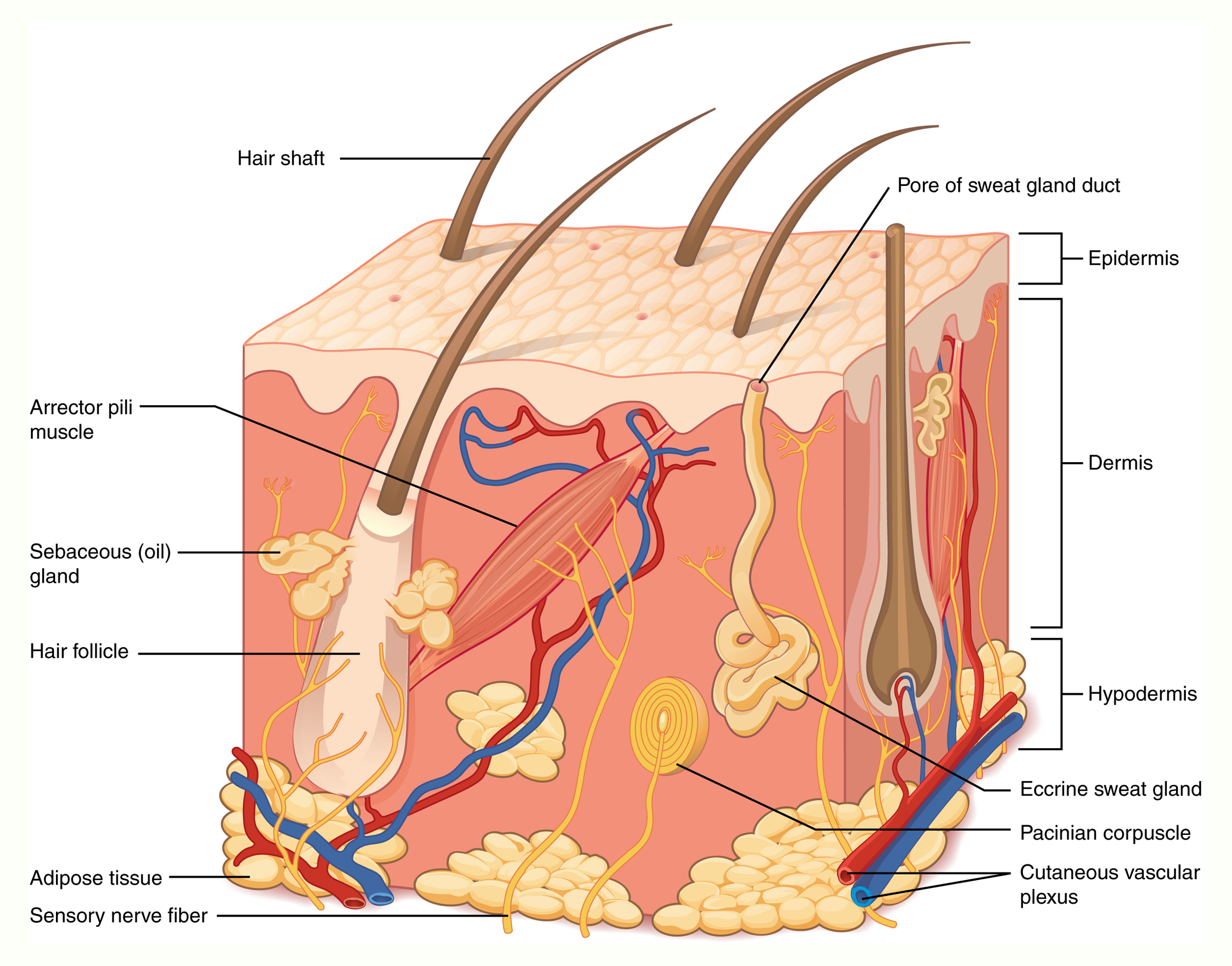 The skin has an upper epidermis with an underlying dermis. You can see these layers in the figure below, as well as part of a deeper hypodermis, or subcutaneous layer. The hypodermis is sometimes called the superficial fascia in gross anatomy and consists of connective tissue and adipose tissue.
