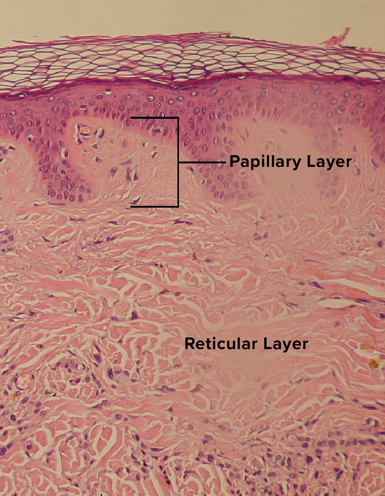 The dermis has two layers, as you can see in the figure below. The very top, darker layer in the figure is the epidermis. The region where the dermis folds up into the epidermis is the papillary layer. The deepest layer of dermis is the reticular layer.