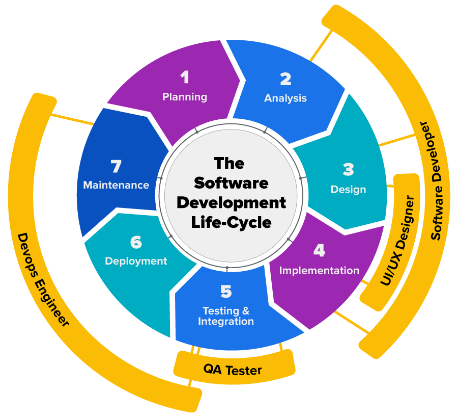 Because software development involves many moving parts, it’s important to understand the different roles that contribute to the process. Each team member typically specializes in a particular area, such as design, coding, testing, or system support, but many roles are involved in multiple phases of the SDLC. Understanding these contributions helps reveal how collaboration leads to more successful software outcomes.