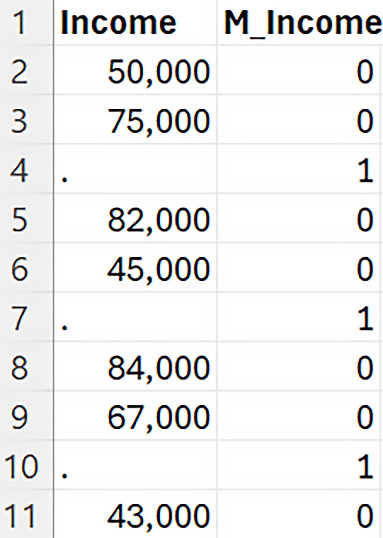 If you encounter a situation where the missingness carries meaning in the context of the business problem, an effective technique is to create an indicator variable, sometimes referred to as a dummy variable. A missing indicator variable is a binary variable that takes on the value “1” if the observation is missing and a value of “0” if the observation is not missing. The figure below shows a missing indicator variable. The column M_Income is the missing indicator variable. The prefix of M_ followed by the name of the column is the naming convention to denote the missing indicator variable. When Income is not missing, M_Income is 0 and when Income is missing, M_Income is 1.