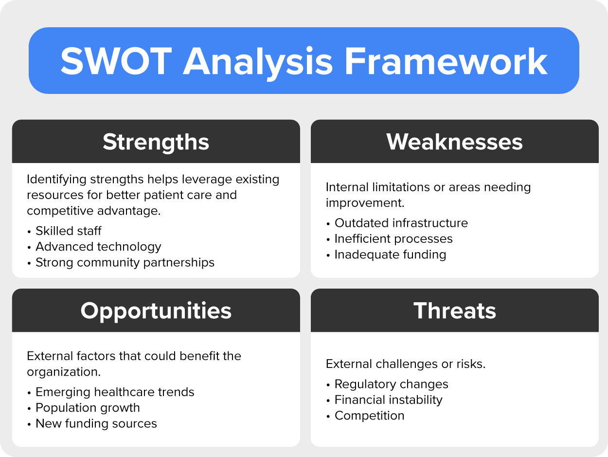 This framework tool is used to assess an organization’s internal strengths and weaknesses as well as the external opportunities and threats. The SWOT approach is a very common approach to strategic planning in health care and public health. Strengths are described as positive attributes within health care or public health organizations. Examples include skilled staff, advanced technology, or strong community partnerships. Identifying strengths helps leverage existing resources for better patient care and competitive advantage. Weaknesses are internal limitations or areas needing improvement. Examples might be outdated infrastructure, inefficient processes, or inadequate funding. Addressing weaknesses is essential for enhancing the overall performance.