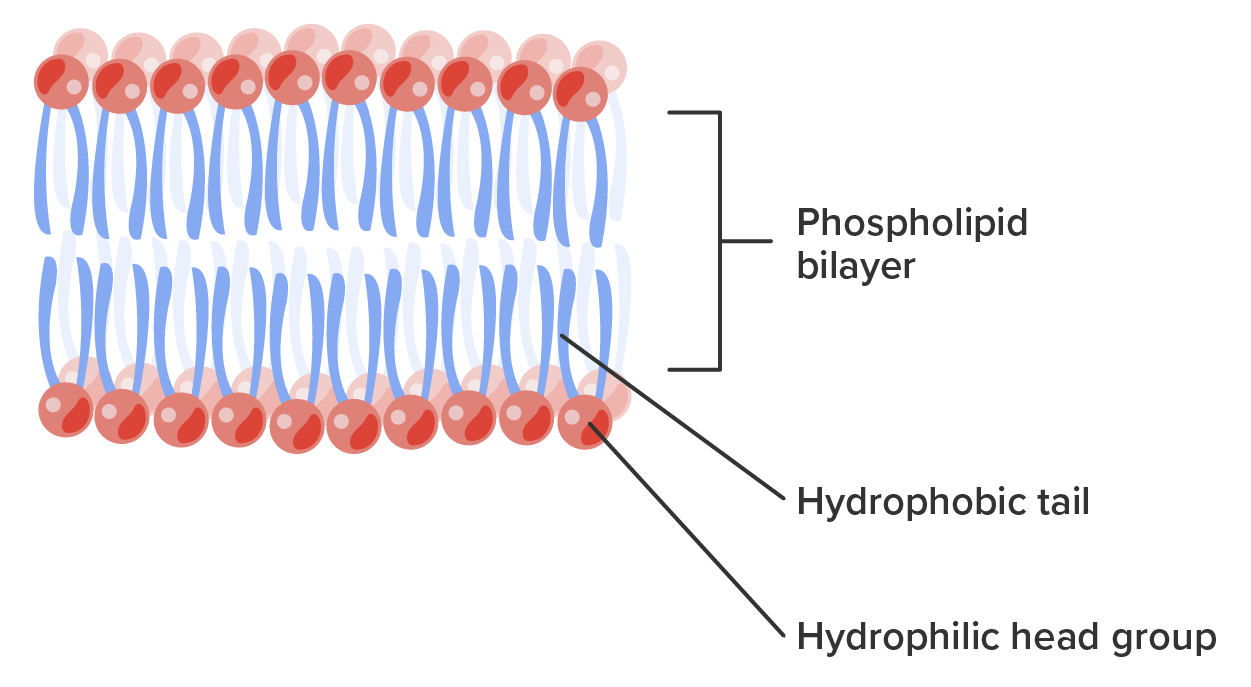 The head is the hydrophilic part, and the tail contains the hydrophobic fatty acids. In a membrane, a bilayer of phospholipids forms the matrix of the structure, the fatty acid tails of phospholipids face inside, away from water, whereas the phosphate group faces the outside, aqueous side (Figure 9).