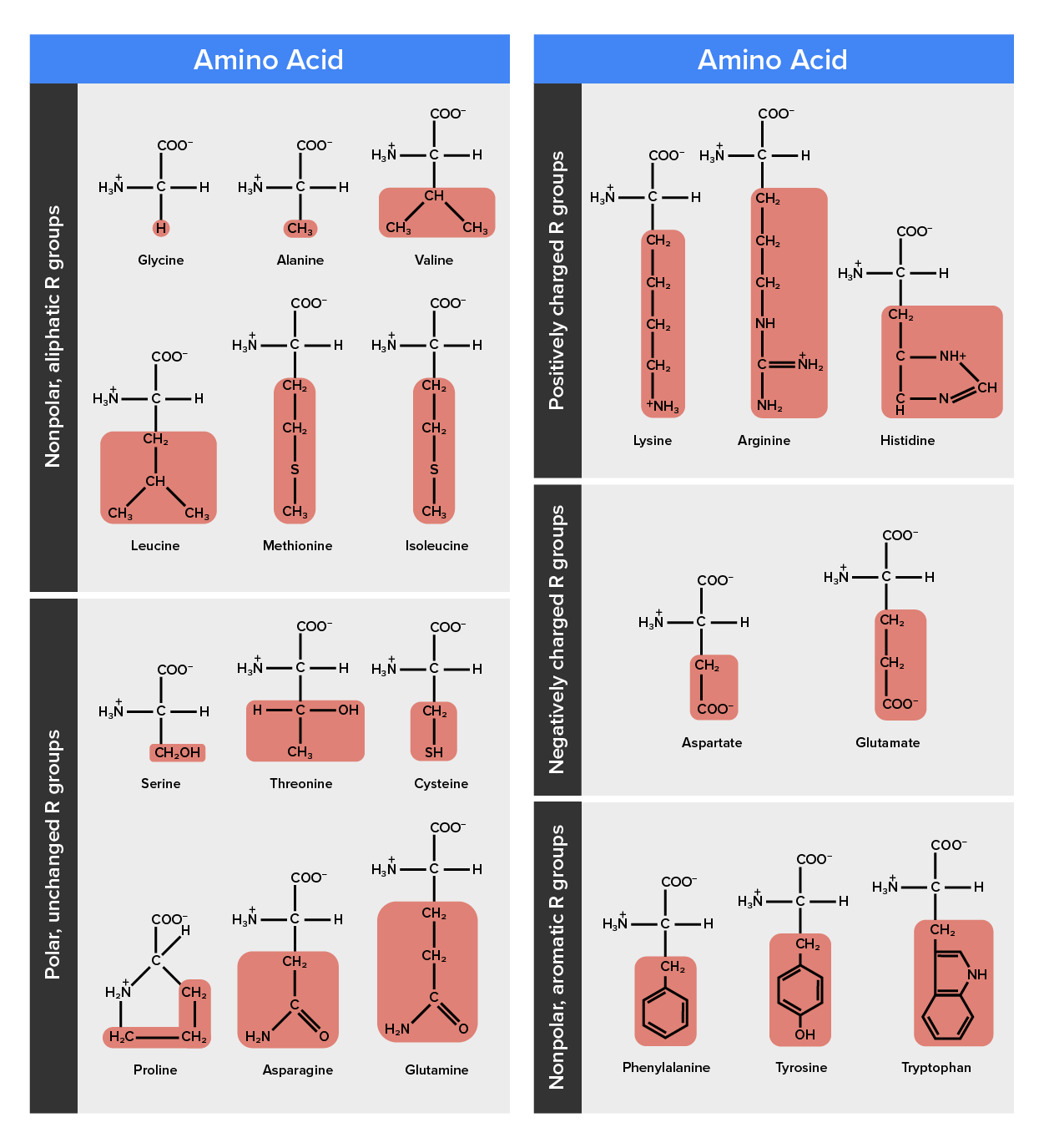 The chemical nature of the side chain determines the nature of the amino acid (that is, whether it is acidic, basic, polar, or nonpolar). For example, the amino acid glycine has a hydrogen atom as the R group. Amino acids such as valine, methionine, and alanine are nonpolar or hydrophobic in nature, while amino acids such as serine, threonine, and cysteine are polar and have hydrophilic side chains. The side chains of lysine and arginine are positively charged, and therefore these amino acids are also known as basic amino acids. Proline has an R group that is linked to the amino group, forming a ring-like structure. Proline is an exception to the standard structure of an amino acid since its amino group is not separate from the side chain (Figure 2).