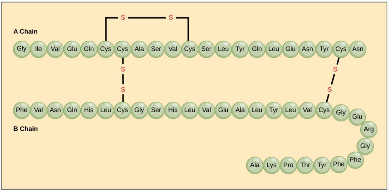 The primary structure of protein is the unique sequence of amino acids in a polypeptide chain. For example, the pancreatic hormone insulin has two polypeptide chains, A and B, and they are linked together by disulfide bonds. The N terminal amino acid of the A chain is glycine, whereas the C terminal amino acid is asparagine (Figure 4). The sequences of amino acids in the A and B chains are unique to insulin.