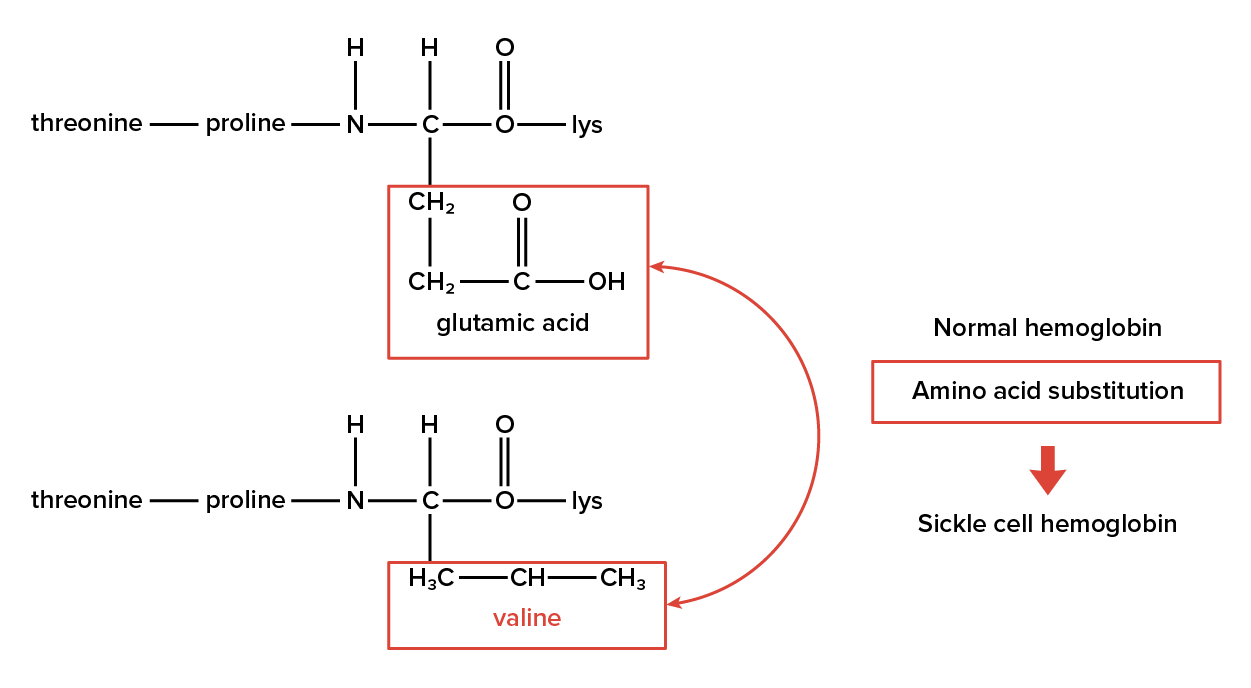 Specifically, the amino acid glutamic acid is substituted by valine in the β chain. What is most remarkable to consider is that a hemoglobin molecule is made up of two alpha chains and two beta chains that each consist of about 150 amino acids. The molecule, therefore, has about 600 amino acids. The structural difference between a normal hemoglobin molecule and a sickle cell molecule—which dramatically decreases life expectancy—is a single amino acid of the 600. What is even more remarkable is that those 600 amino acids are encoded by three nucleotides each, and the mutation is caused by a single base change (point mutation), 1 in 1,800 bases.