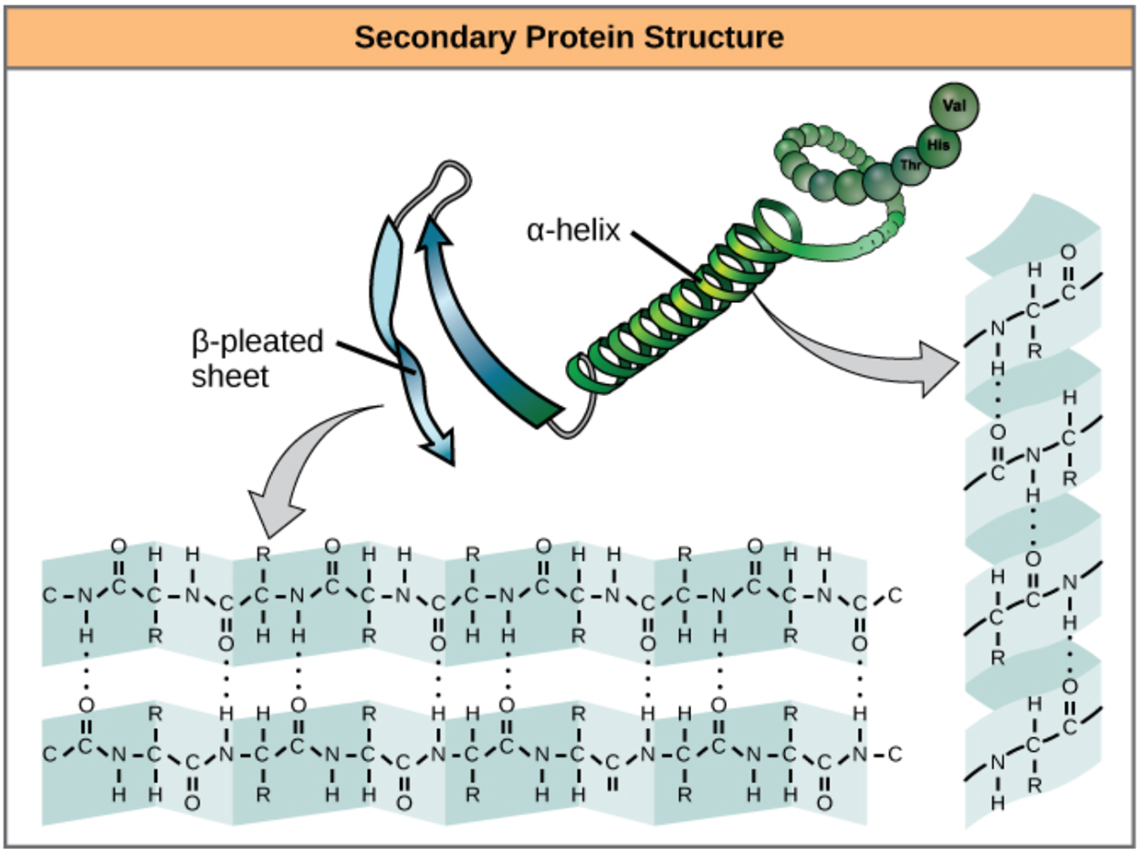 The local folding of the polypeptide in some regions gives rise to the secondary structure of protein. The most common are the α-helix and β-pleated sheet structures (Figure 7). Both structures are the α-helix structure—the helix held in shape by hydrogen bonds. The hydrogen bonds form between the oxygen atom in the carbonyl group in one amino acid and another amino acid that is four amino acids farther along the chain.