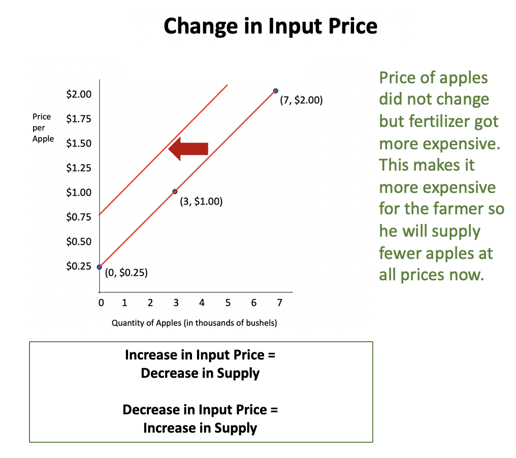 As a reminder, a change in input price like an increased cost for fertilizer will cause a decrease in supply and shift to the left.Now let's shift our focus to a discussion of demand. Demand is easier for most people to think about because we are consumers who are purchasing stuff almost every day of our lives.