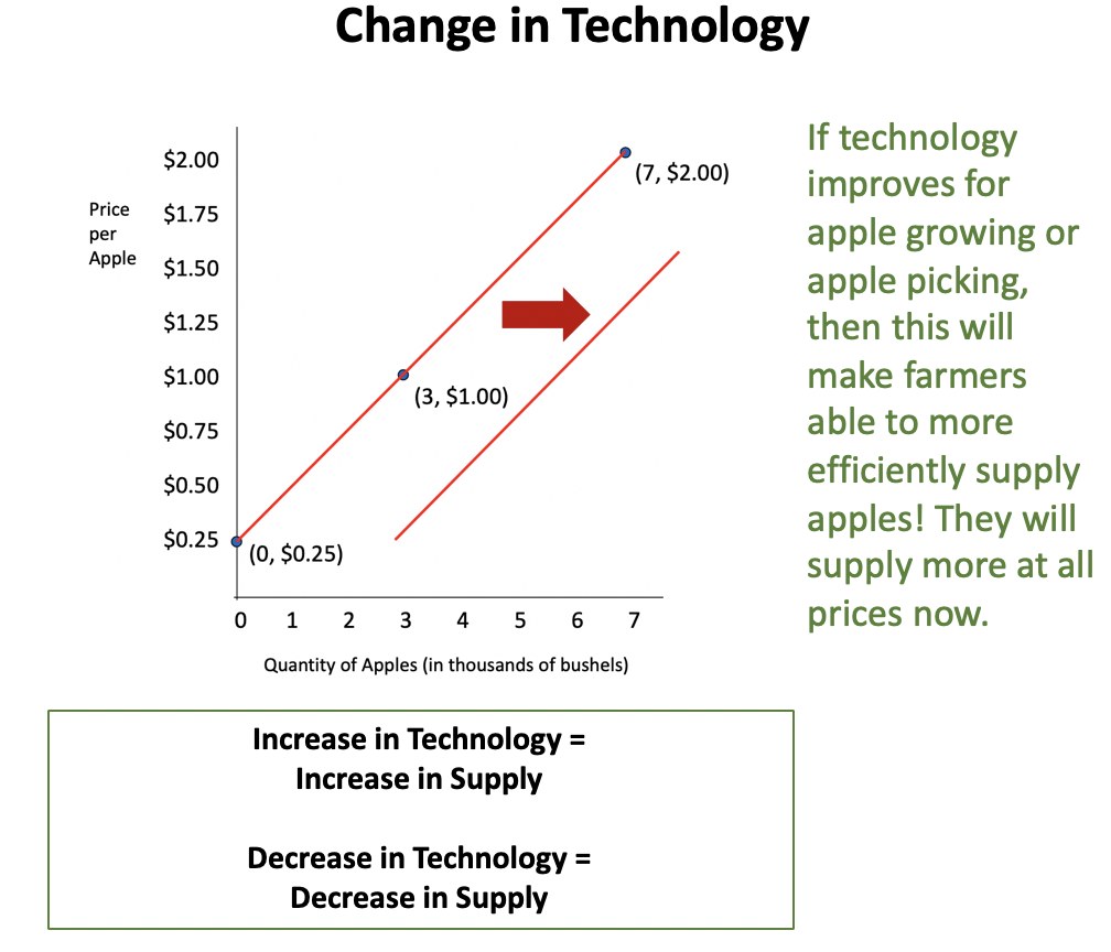 However, what ceteris paribus assumes is that the price of apples is the only thing that changed. For instance, it assumes that the price of their resources, or inputs, did not change, nor did their technology. Only the price of the apples changed, which correlates to that movement along the curve.