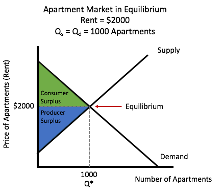 Notice, though, the consumer surplus in the green area. This area represents all the people who were willing to pay more than $2,000. In addition, the producer surplus area represents all of the landlords who were willing to rent for less.