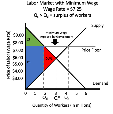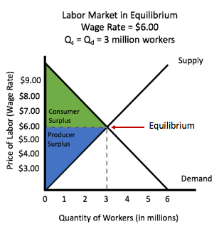 However, the government does not allow companies to pay workers $6 per hour, because of the minimum wage law. Now, if the labor market were allowed to be in equilibrium, there would not be a deadweight loss to society. Consumer and producer surplus would be maximized as shown by the green and the blue triangles below.