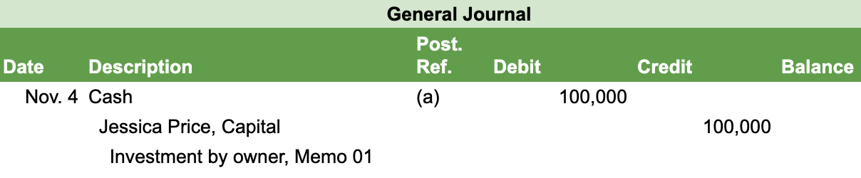 In the T-accounts, we recorded a debit for $100,000 in the cash account and a credit for $100,000 in Jessica Price’s capital account. We transfer that same information to the general journal along with a description of the transaction. We use the posting reference column to link the transactions. A posting reference is a column in the general journal that indicates the link between transactions and accounts. Since this transaction is labeled (a) in the transaction list and in the T-accounts, we can label it (a) in the journal entries to show the link at each stage.